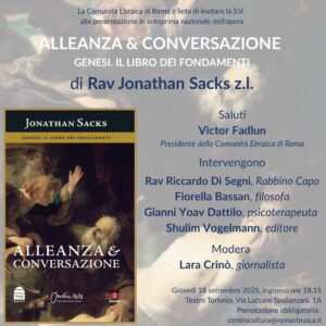 La Comunità Ebraica di Roma è lieta di invitare la S.V. alla presentazione in anteprima nazionale dell’opera Alleanza & Conversazione Genesi. Il libro dei fondamenti di Rav Jonathan Sacks z.l. Saluti Victor Fadlun, Presidente della Comunità Ebraica di Roma Intervengono Rav Riccardo Di Segni, Rabbino Capo Fiorella Bassan, filosofa Gianni Yoav Dattilo, psicoterapeuta Shulim Vogelmann, […]