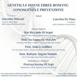 Genetica e donne ebree romane: conoscenza e prevenzione Saluti Giacomo Moscati Assessore alla Cultura della Comunità Ebraica di Roma Caterina De Mata Presidente della Fondazione Ernesta Besso Intervengono Rav Riccardo Di Segni Rabbino Capo della Comunità Ebraica di Roma Dott. ssa Laura De Marchis Oncologa, Policlinico Umberto I Sapienza Università di Roma Prof. Alain J. […]